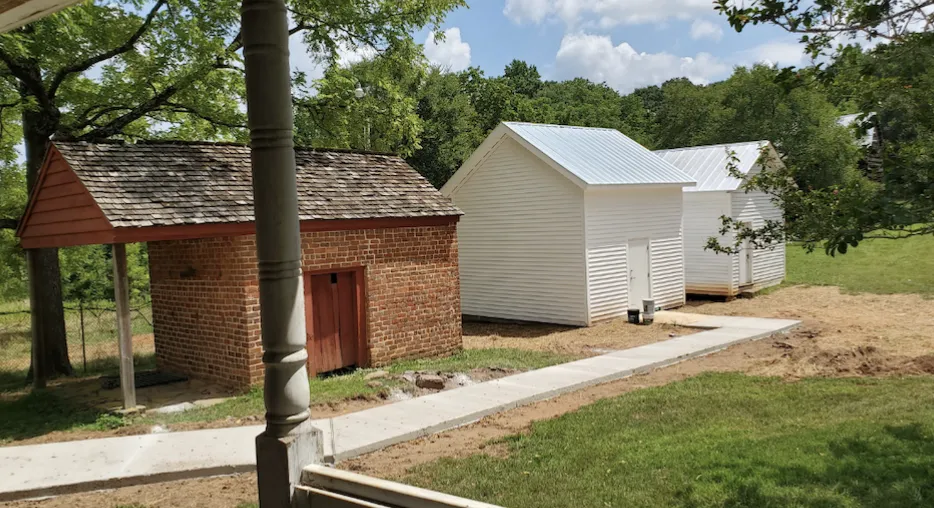 German-American construction features, the main block of which reflects two, and possibly three, phases, but the exact construction dates have not been determined. A major renovation, c. 1810, added a late Georgian and Federal finish, as well as front and rear shed porches. A brick well house and a frame smokehouse, both east of the house, date from the 19th century. Almost nine acres (36,000 m2), with several large walnut trees, surround the buildings.[1]